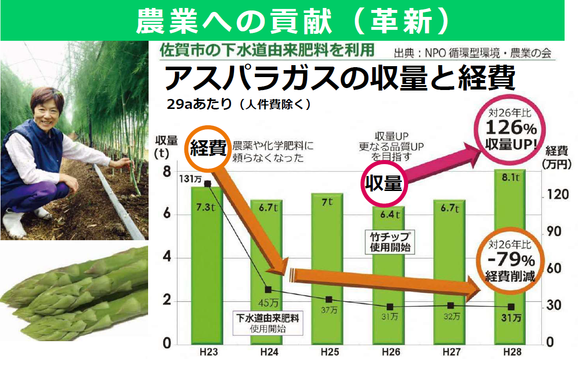 佐賀市のアスパラ農家の事例です。下水汚泥肥料を利用することで、経費が利用開始前と比べ約79%削減できる一方で、収量は26%アップしました。大幅な農業所得の向上が得られた事例です。