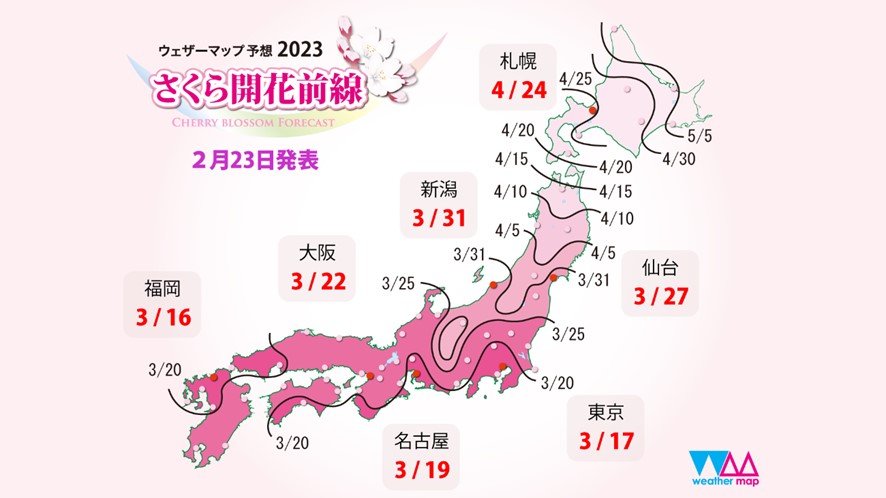 先月のコラムでもお伝えした桜開花予報ですが、こちらも今回の予想を受けて大幅な修正となっています。