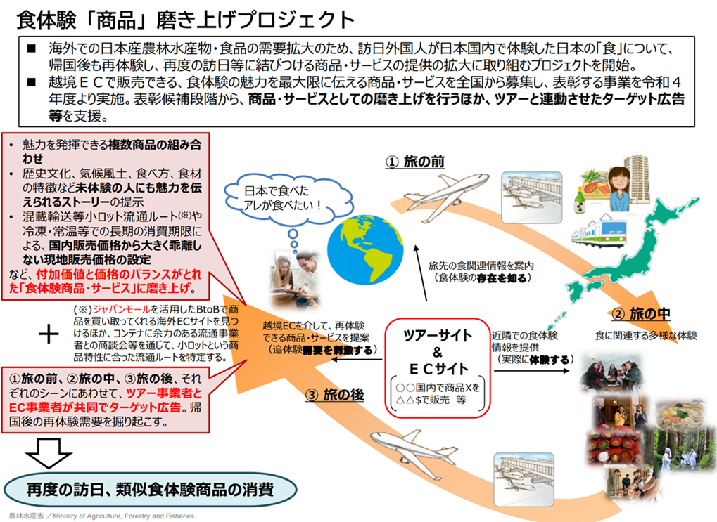 農林水産省では、訪日客の食を絡めた体験を通じて、日本の食文化に触れ、帰国後、再消費する好循環の仕組みを構築・輸出拡大を図ることを目的に、平成31年度から「食×プロジェクト」として取り組んでいます。