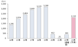 複数のシンクタンクの分析によれば、今後、外的環境が大きく変わらない限り、令和5年は2,000万人を超えると予測しています。そして2024年には、コロナ前の水準にまで回復することが考えられます。