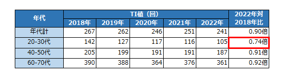 年代別にみると年代が下がるほどTI値が小さく、果物を食べる頻度が低くなっていました。TI値の推移でみても、20-30代が2022年対2018年比で0.74倍と著しく減少しており、若者の果物離れが進んでいると見られます。