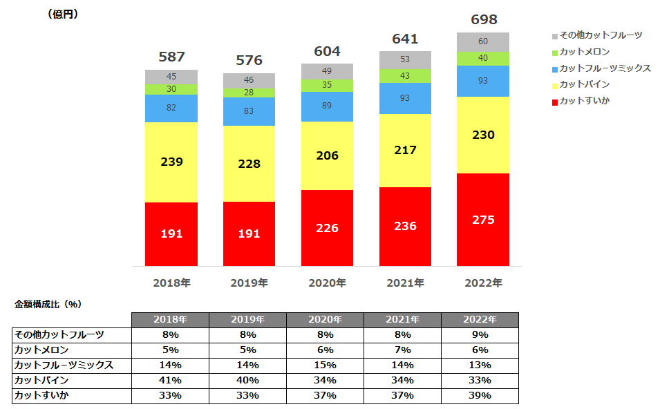 カットフルーツの金額構成比を見ると、2018年〜2022年の5年間、すいかとパインの2種類で70%以上を占めています。
