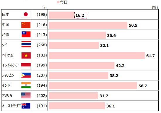 国別の結果を見ると、日本人の毎日果物を食べている人の割合は16.2%と他国に比べて非常に少ないことが分かりました。ベトナムの6割超えを筆頭に、インド、中国も5割超え。他のアジアの国々も4割近くに達し、オーストラリアやアメリカでも3割を超えるなど、いかに日本が低いかが見て取れます。