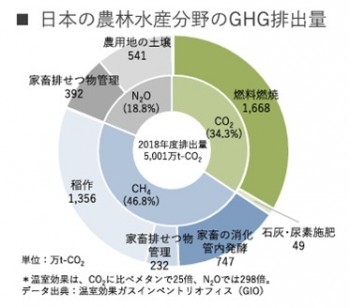 そして、農林水産省の調査によると、日本の農業分野の温室効果ガス排出量は約5,000万tとされ、これは国内全体の3.9%相当ですが、CO2の25倍の温室効果があるメタンガスが1,356万tと全体の約30%を占めており、農業でも温暖化緩和の取組が求められております。