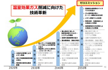 このような状況から、農林水産省は「ゼロエミッション達成に向けたロードマップ(みどりの食料システム戦略)」を策定。温室効果ガス削減に向けた技術革新を行い実質排出量0を目指しております。
