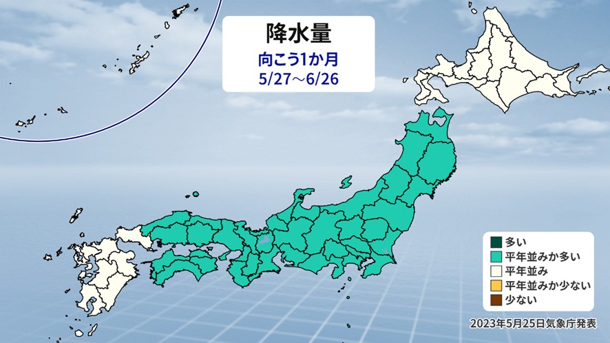 今月は、梅雨前線や、今回迫ってきている台風2号の影響も重なり各地で平年より雨量が多くなる予想となっています。