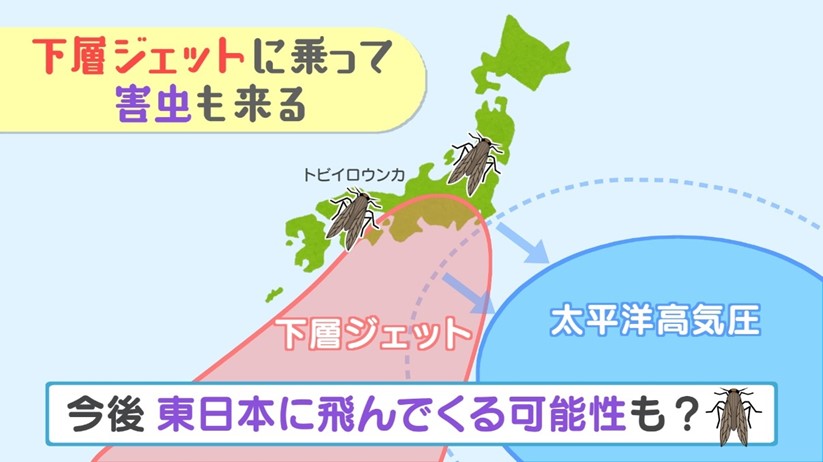 これらの害虫は中国大陸からこの下層ジェットに乗って日本にやってきます。例年、西日本を中心に被害が多発しますが、下層ジェットが東に移動する事で、今後東日本まで被害が増えてもおかしくないでしょう。