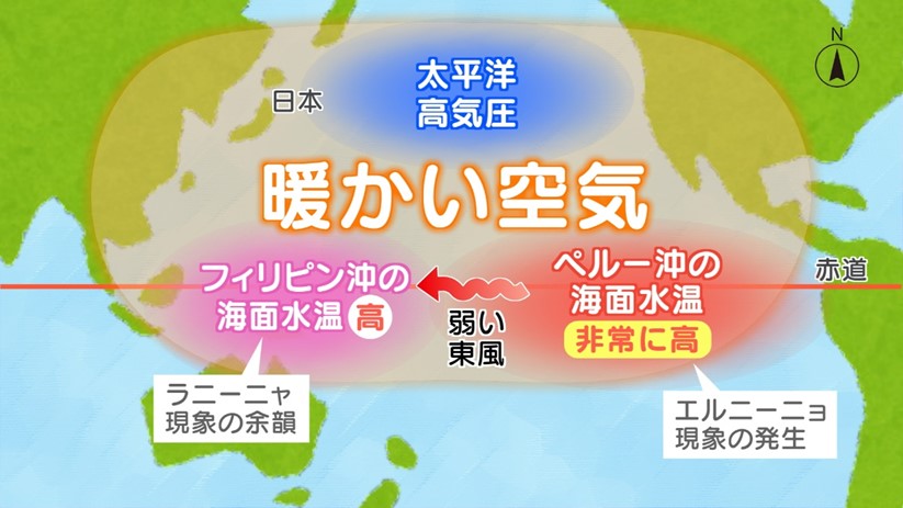 これは、地球温暖化、さらには今年の冬まで続いた「ラニーニャ現象」の余韻と、今年春に発生したエルニーニョ現象が影響していると言われています。