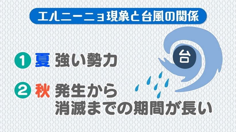 さらに気象庁では、エルニーニョ現象が発生した時の過去の台風との関係を調べていて、実はとんでもない傾向が出ています。それは、①夏、最も発達した時の台風の中心気圧が平常時よりも低い傾向にある事(勢力が強いという意味)、②秋、台風の発生から消滅までの寿命が長くなる傾向があるという事です。