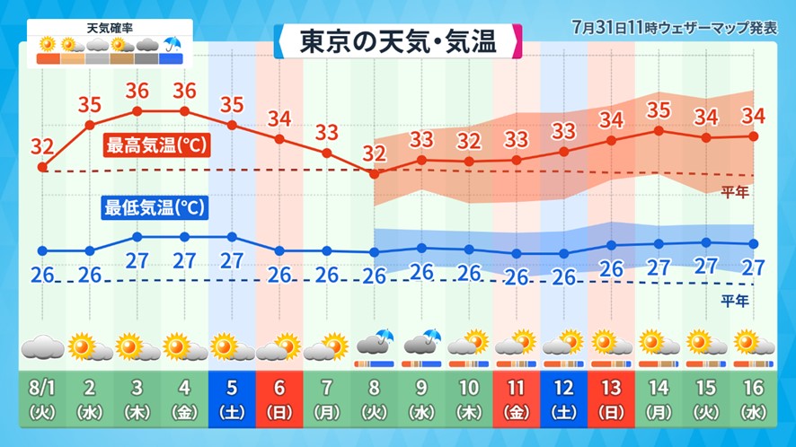 ウェザーマップ独自の16日予報で、東京の予想を見ていきます。今月始めは、猛烈な暑さが続く見込みです。