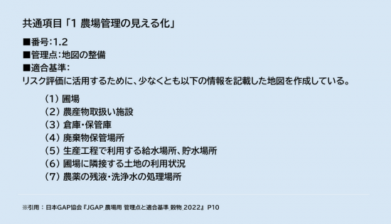 実際に、日本GAP協会が定めるJGAPやASIAGAP、さらには各都道府県独自のGAPについても、自分たちの管理圃場や農産物取扱施設、倉庫などが記載されている地図の作成を求めています。