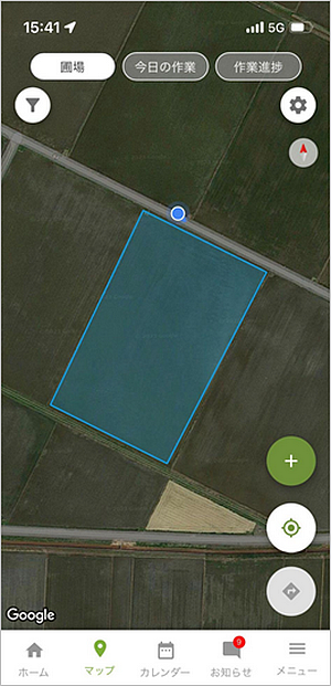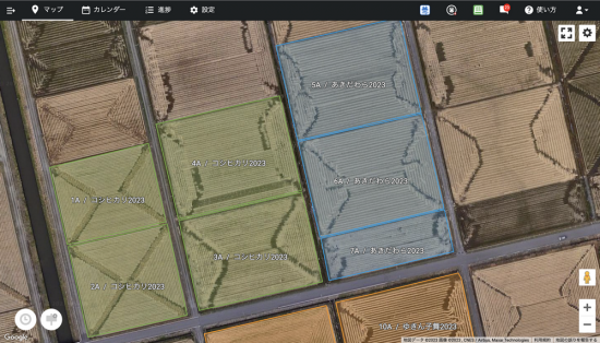 アグリノートはGoogle Mapをベースとした航空写真を活用し、栽培している作物ごとに圃場を色分けしたりして、デジタルな農場地図を作成することができます。