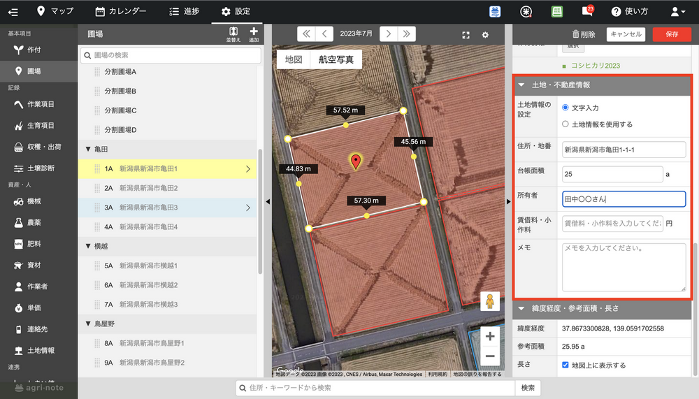 さらにアグリノートでは、圃場の名称や作付面積だけでなく、地番などの情報も登録できます。
