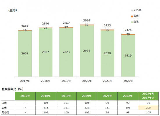 ただし、玄米の販売金額は、2022年対2017年比で205%と2倍を超えるまで増加しています。
