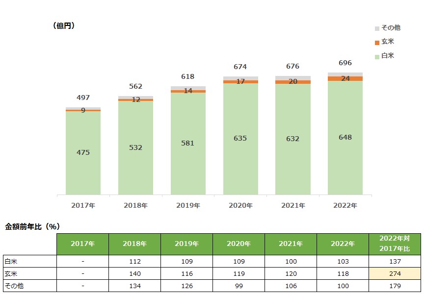 玄米タイプが人気となっていることは米と同様で、玄米タイプの2022年対2017年比は274%と3倍近くにまで拡大が見られました。