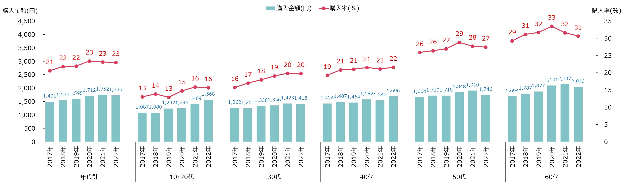 一方、購入金額・購入率ともに著しく伸びているのが、10・20代の若年層です。2022年対2017年比で購入金額が1.4倍、購入率が1.2倍と伸長。