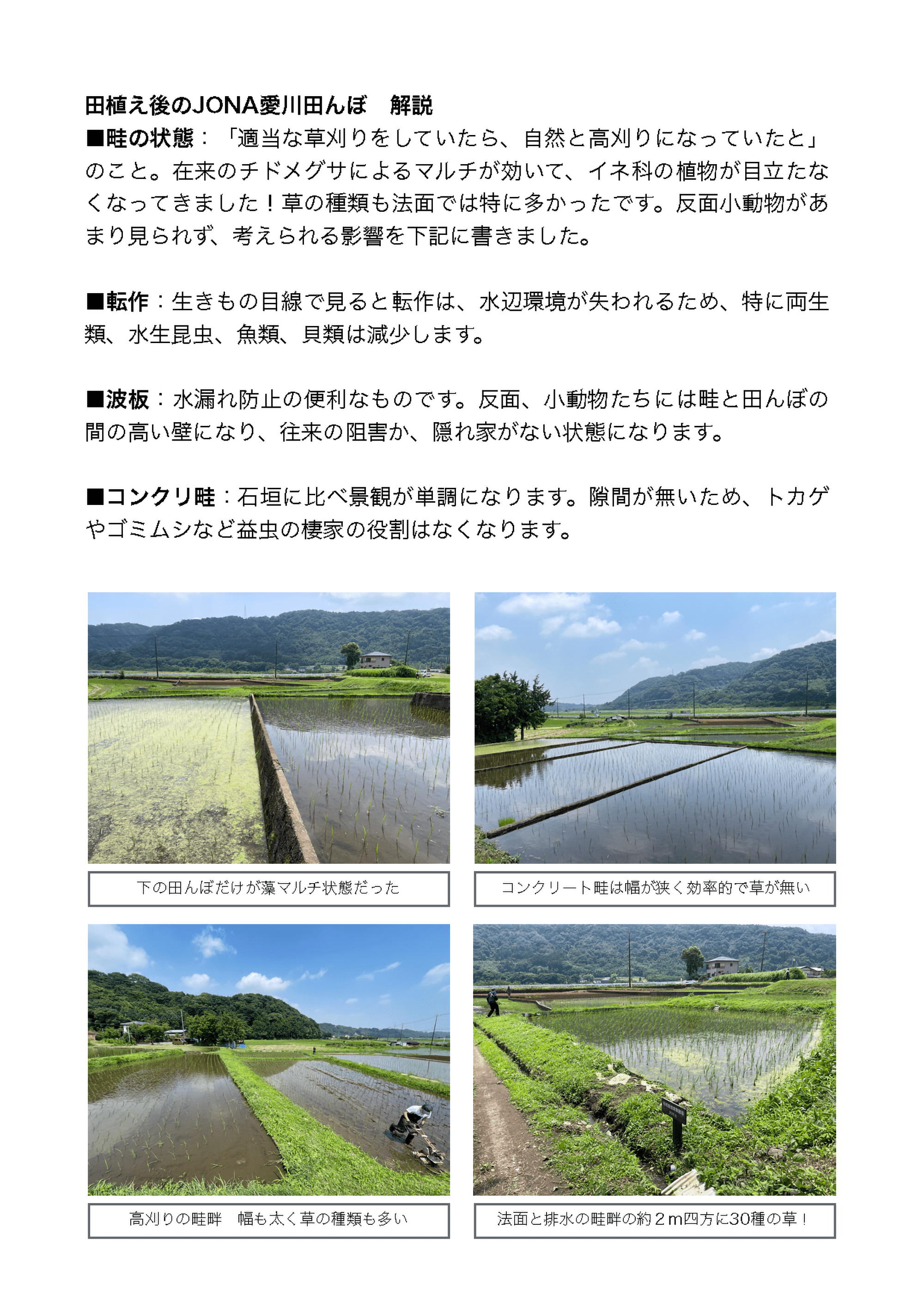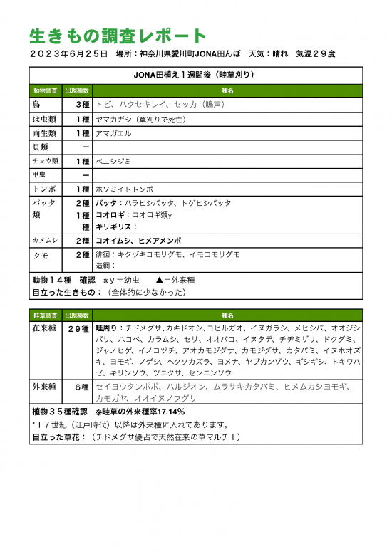 ご参考までに、日本オーガニック&ナチュラルフーズ協会(JONA)が次代の農と食をつくる会のサポートで運営している「米麦大豆2年3作実験圃場」における生きもの調査の最新結果を掲載します。