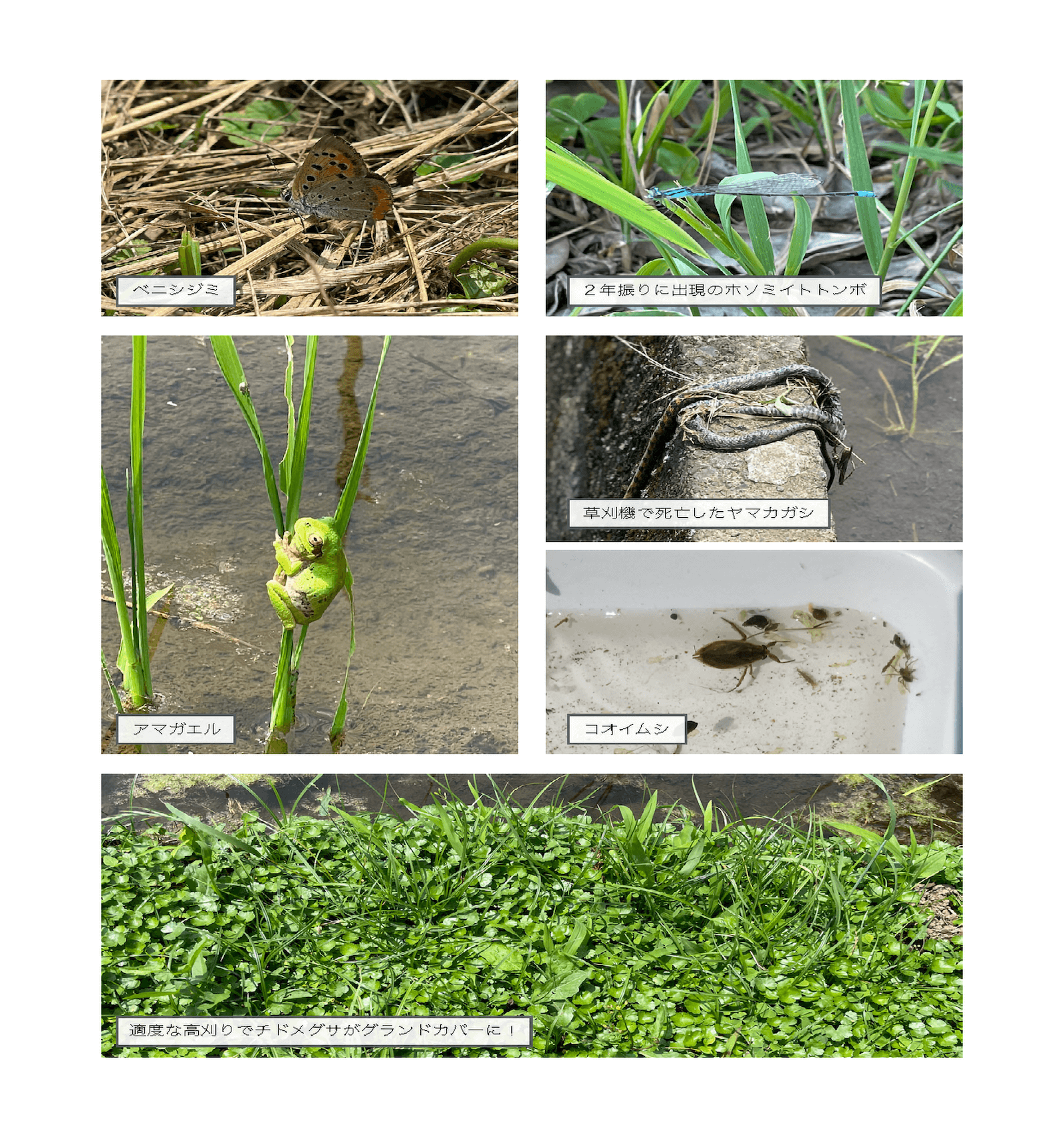毎年、春と秋に生きもの調査を実施して、生きものとのバランスを考えながら有機栽培実験を続けています。