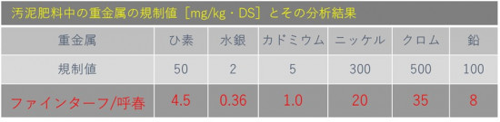 重金属類の含有量についても、肥料の品質の確保等に関する法律で定められた規制値を下回っています。