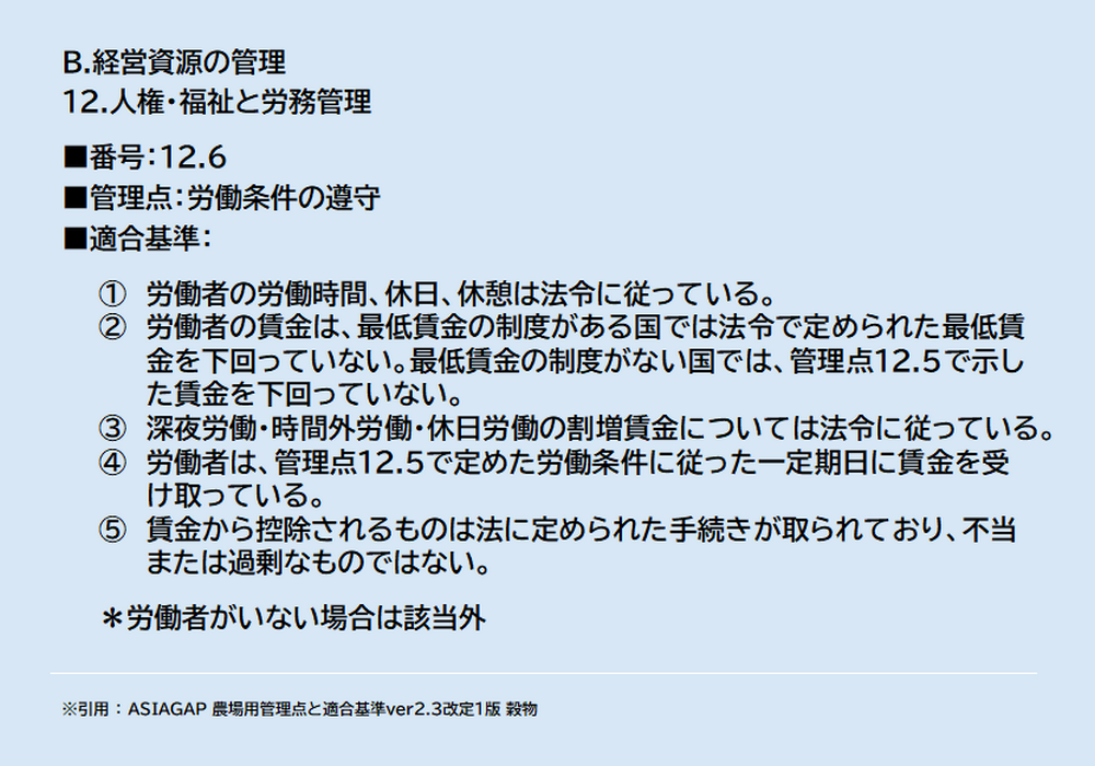 GAPの適合基準では、人権保護の観点から労働条件を文書等で明示した上で、その労働条件を遵守することを求めています。