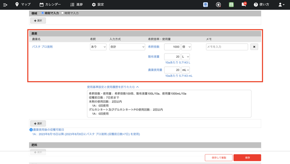 (パソコンブラウザ版アグリノートの作業記録作成画面(農薬))![]()
