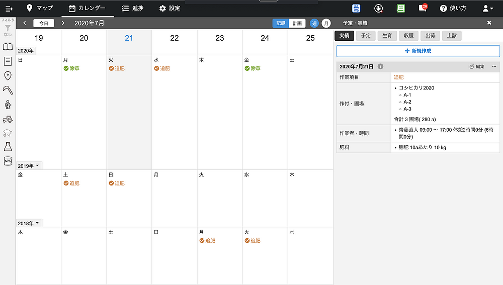 (パソコンブラウザ版アグリノートの「記録を見る」画面)