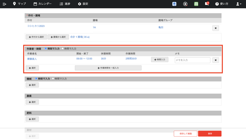 (パソコンブラウザ版アグリノートの作業記録作成画面(作業者))
