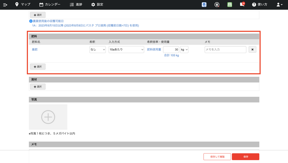 (パソコンブラウザ版アグリノートの作業記録作成画面(肥料))