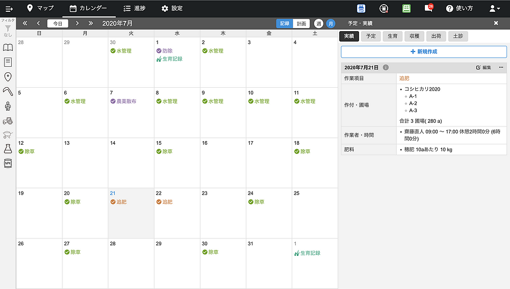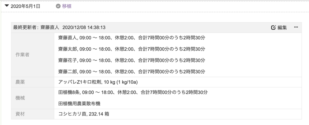 作業記録の内容は、圃場ごとに集計されるので、その圃場に対していつ・どんな作業を行ったのかを見やすく振り返ることができます。