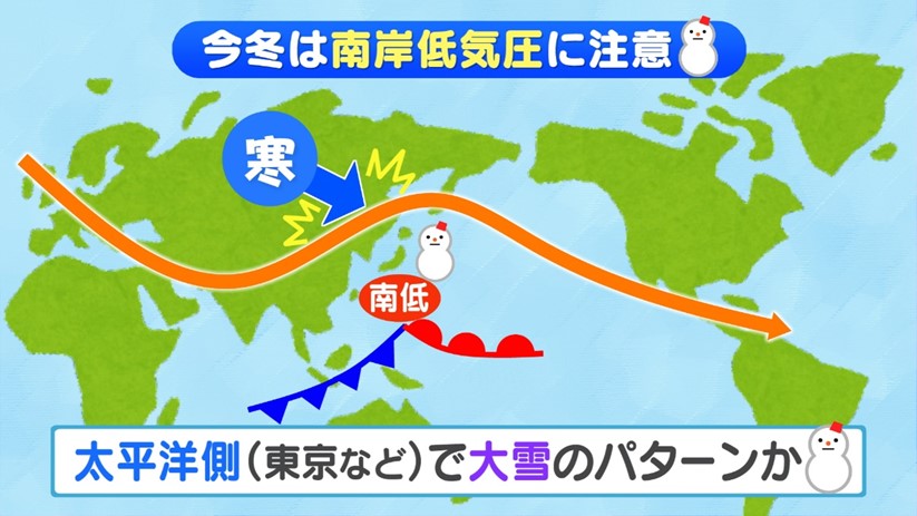 冬の時期にくる低気圧は「南岸低気圧」と呼ばれ、東京で大雪を降らせるのは100%この南岸低気圧です。