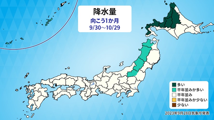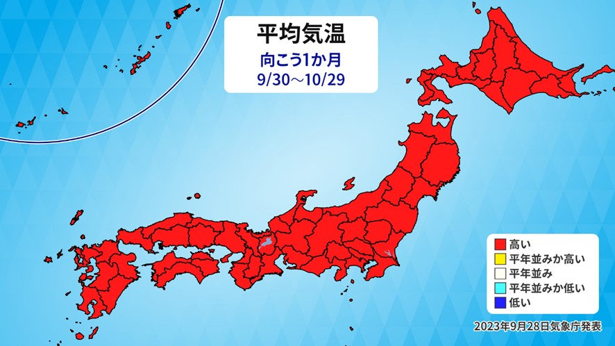 気温が2週目以降ガクッと下がり、暑さが少し落ち着きそうです。とは言えまだ平年より少し高いので、今月は暖かい秋と言えます。
