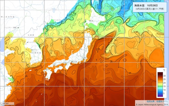 気象庁が発表している海面水温の予想を見ると、10月末にかけても日本の近海で25℃以上の暖かさが続く予想です。