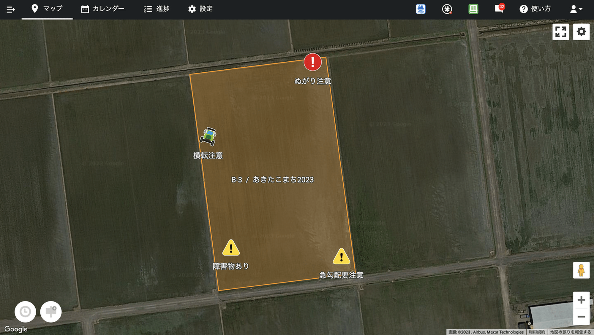 機械の転落や転倒が起きる要因には、機械の誤操作や運転時の不注意など人的要因もありますが、圃場出入り口の急勾配での横転や農道の見えにくい水路への転落など地理的要因もあるので、農業機械作業中の事故を減らすためにも、圃場や農場の周辺環境の危険箇所を見える化することが大事です。