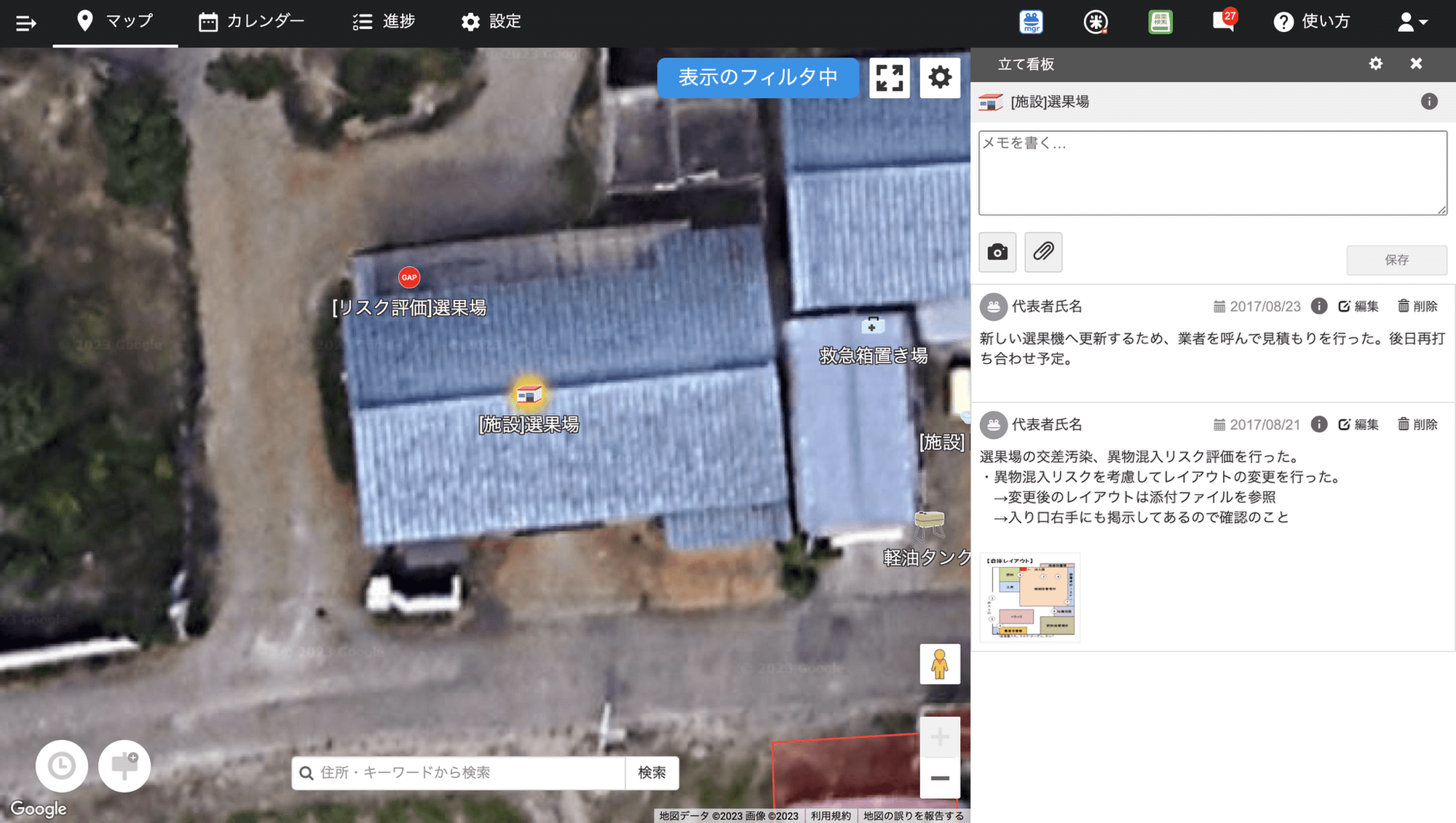 このように立て看板機能を活用することで、圃場や周辺環境の危険箇所を見える化して作業者の労働安全の確保に役立てられるだけでなく、メモや添付画像で作業者への情報の周知といったより効率的な情報共有が可能です。