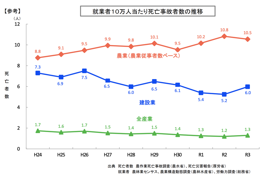 これは令和2年よりも24人減少をしているものの、就業者10万人当たり死亡事故者数で見ると、建設業が10万人あたり6.0人なのに対し、農業は10万人あたり10.5人と高い水準となっています。(※2)