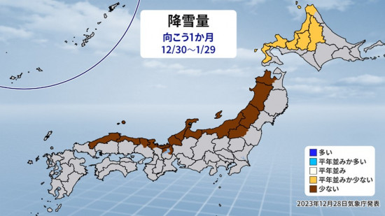 続いて降雪量を見ると、日本海側の地域では雪が少ない予想です。