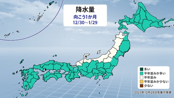 これは日本に暖かい空気が流れ込みやすい状況が続くため、1月も全国的に気温が高い予想となっています。