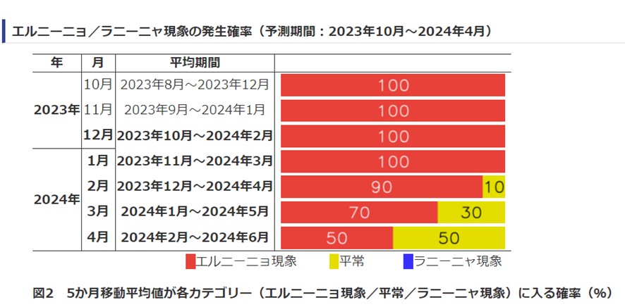 気象庁発表のエルニーニョ監視速報によると、春にはエルニーニョが終わる可能性が50%の予想となっているのです。
