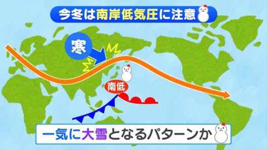 冬の時期にくる低気圧は「南岸低気圧」と呼ばれ、東京など普段雪の降らない地域で積雪させるおそれがあります。