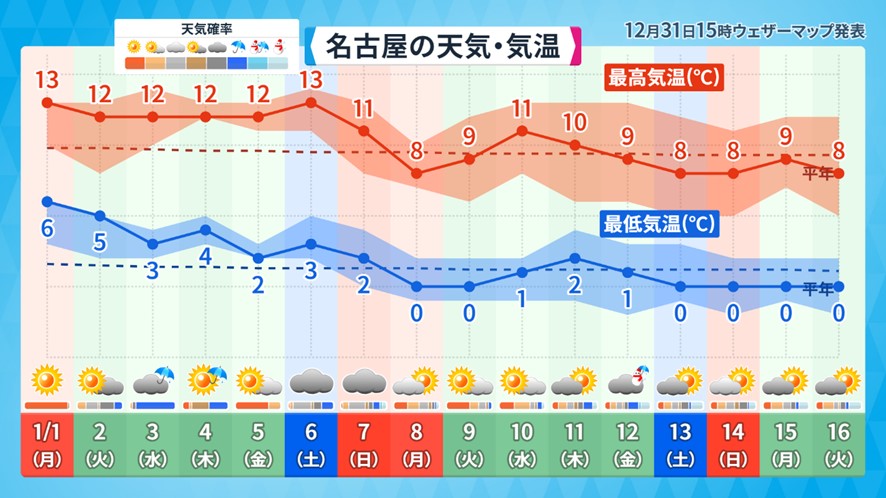 名古屋の予報を見てみると、やはり気温は平年より高めの日が多いですが、12日には雪マークがついています。