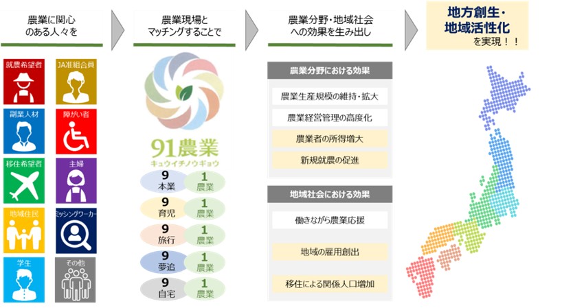 JA全農は91農業を通じ、生産者へは繁忙期などの必要な時にのみ人手を確保する手段を、農業に興味がある人や将来農業を志す人へは農業を経験する場を提供していきたいと考えています。