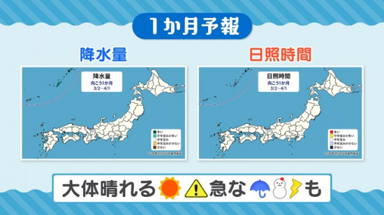 また、1カ月予報の降水量と日照時間も見ていきます。