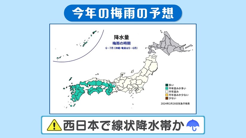 近畿、中国、四国、九州、沖縄、奄美など西日本を中心に降水量が平年並みか多い予想となっています。