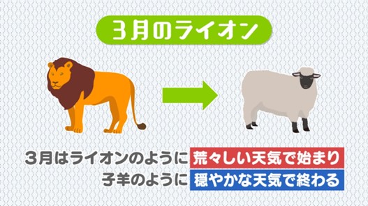 「3月はライオンのようにやってきて、子羊のように去っていく。」というイギリスの天気のことわざの事です。