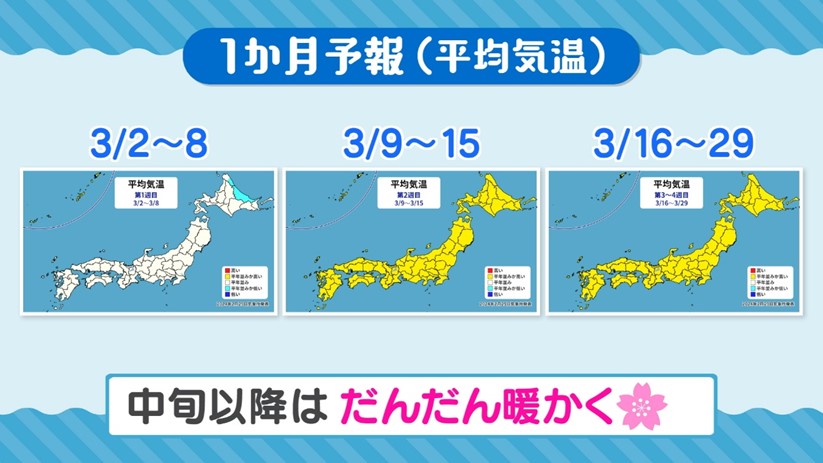 その後、中旬以降は全国的に暖かい空気に覆われやすく、気温が上がっていきそうです。