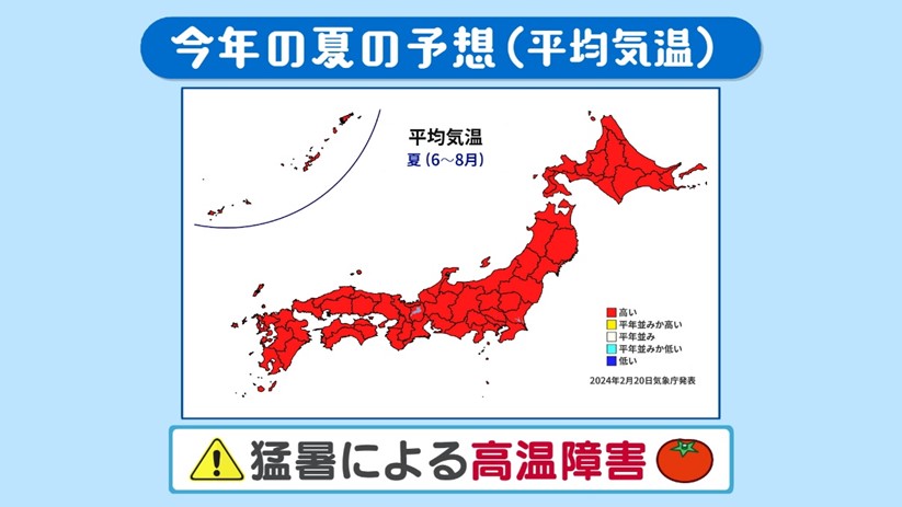 すると6〜8月の期間は全国的に平年より気温が高い予想となっています。