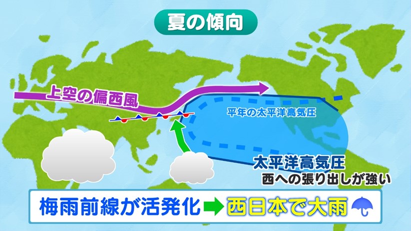 すると積乱雲から下降してきた空気が太平洋高気圧の勢力をいつもの年より西側に強めていきます。
