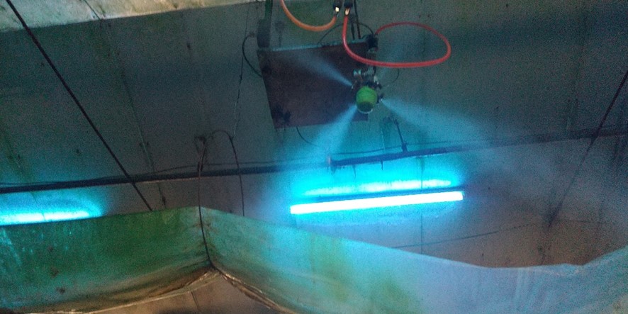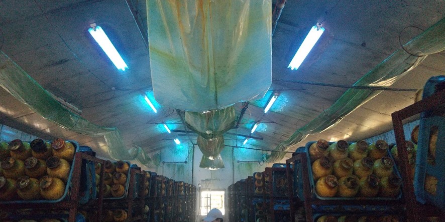 また、霧吹きの他に電灯も沢山設置されていました。微妙なほのぐらさにしているのにも理由がありました。実はこれは、紫外線の電灯です。人が歩けるくらいの明るさにしているのではなく、紫外線をあてる事でまいたけを黒くさせているのです。人間でいうところの日焼けですね。