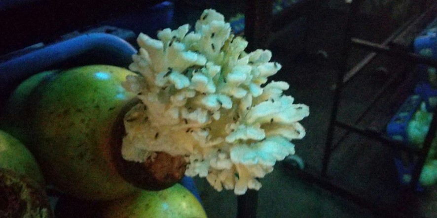 紫外線電灯のあたりにくい、下の方にあったまいたけは確かに白色でした。こういった白いまいたけを手作業で上に移動させながら、綺麗に色付けをしていくのだそうです。