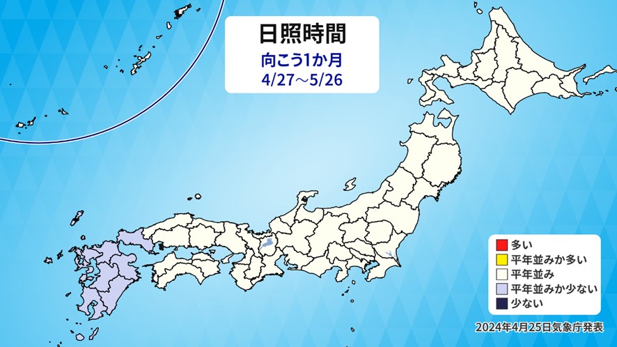 一方で、こちらは日照時間の1か月予報です。すると、今月九州では日照が少ない可能性が出ています。こちらは暑さに加え、湿った空気が流れやすい予想となっています。九州南部の平年の梅雨入りは5月30日です。そろそろ雨雲がかかりやすくなる時期になってくる九州では、日照不足や急な大雨にも注意が必要となりそうです。